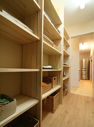 納戸は買い物帰りに勝手口から入ってすぐに収納、整理できるので助かります。