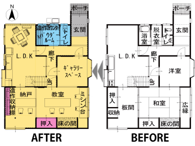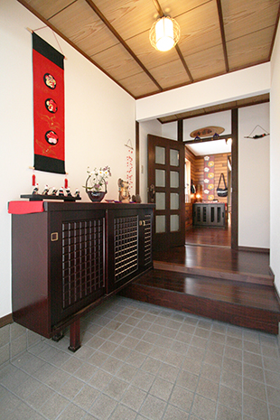 奥様の和小物のアトリエ・教室を始めるにあたり、部屋を明るくし、湿気をなくしたいというご要望でした。ギャラリースペース~教室~納戸の間を仕切る建具をなくしたことで、バリアフリーにも考慮した明るく、風通しの良い空間をご提案しました。欄間などの既存部分とご提案した無垢の床材で、和の趣のある、和小物が映えるスペースにしました。パウダールームは広くとり、カウンターを造作するなど女性にやさしい空間を実現しました。