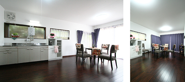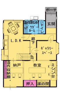 LDKは歓談の場として、生徒の方と一緒に教室後のお茶や会話を楽しめます。また、教室やギャラリースペースと同じ無垢材の床で統一感を。