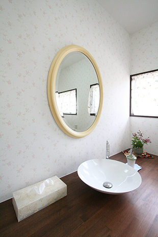 ■施工内容/手洗器:カクダイ/トイレ:TOTO ZJシリーズ/床:無垢フローリング(UV着色塗装)、クッションフロアー(パウダールーム、トイレ)/天井:クロス、既存/壁:クロス、既存/収納棚造作/カウンター造作/外壁塗装/