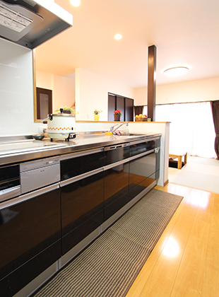 料理しながらでも、畳コーナーやカウンターにいるご家族とコミュニケーションが取れる空間。
