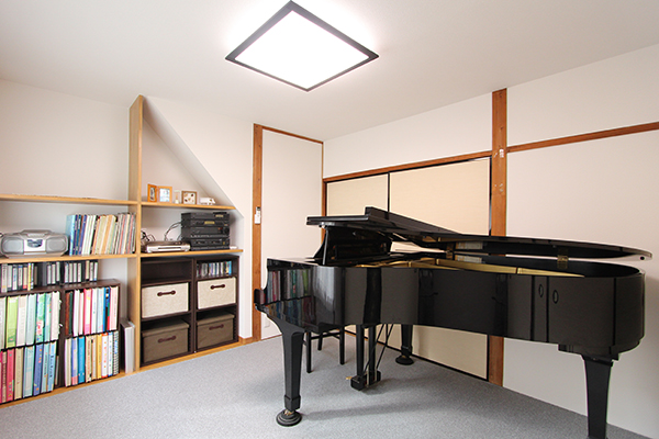 リビング側にあった収納を半分にし、ピアノルームの収納として利用。楽譜やCDも整理でき、大きなグランドピアノを置いていても部屋がスッキリします。