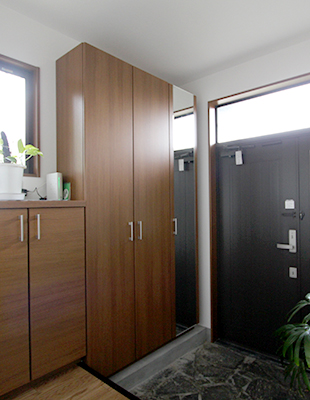 今までよりもっと収納できるよう、天井までの収納を提案。収まりきらなかった靴も収納でき、スッキリした玄関に。