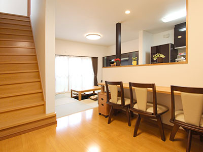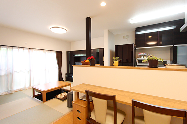 ゆったりできるスペースにと、リビングとなる畳コーナーに掘りごたつを作ってもらったり、家族の食事を取る時間がバラバラなので、対面キッチンにカウンターを作ってもらうことで、いつでも簡単に食事が取れ、家族とのコミュニケーションも取れるLDKになりました。