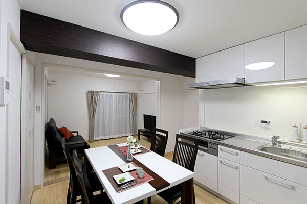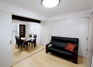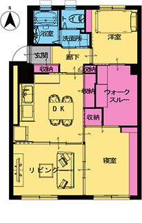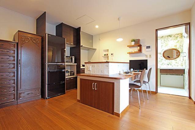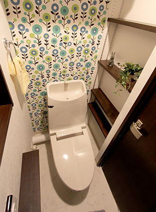 リビング、ダイニング、寝室の3部屋を扉の開閉で仕切る事で扉を開けた時に部屋に繋がりができ、風通しも良く、部屋を広く感じられるようになりました。以前は収納に収まりきらなかった物も、プランナーさんにウォークスルーや収納スペースを随所に工夫して頂き、外に出てしまっていた荷物もスッキリです。また北欧調のインテリアが好きな私好みのクロスを提案して頂き、大変気に入り洋室の収納部だけでなく、トイレにも使って頂きました。