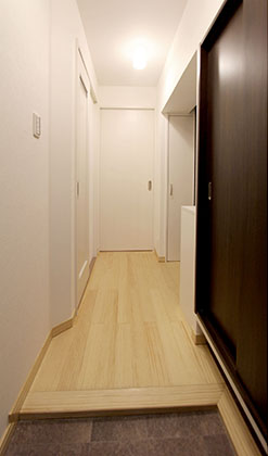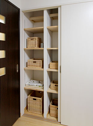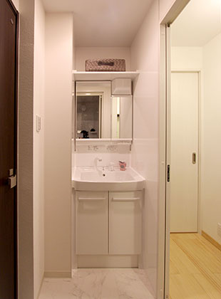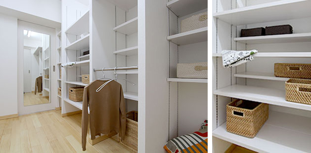 可動棚を設置したウォークスルーには、頻繁に使うものは手前、そうでないものは奥の棚に収納出来ます。棚の高さは収納物に合わせて調節でき、スッキリ納まります。洋室側の扉には鏡を貼り、お洋服選びもスムーズに。