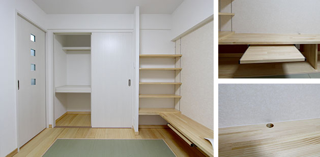 布団をしまう収納と可動棚で収納も充実。カウンターにはPCの配線を通す穴をあけ、キーボードが置けるスライド式のテーブルを取付け、スッキリと納まります。