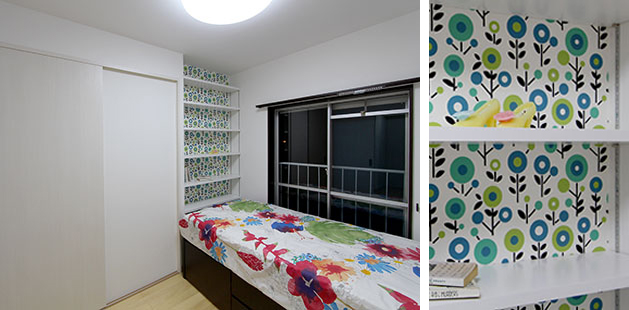洋室の可動棚部分は、お部屋のポイントに奥様お気に入りの北欧テイストのクロスを提案。