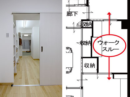 ウォークスルーは収納としてだけでなく、扉を開くことで部屋が一直線に繋がり、風通しが良くなる効果も。