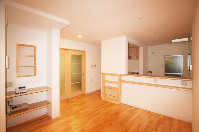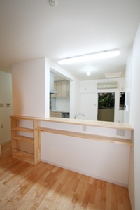 リビングとDKを程よく仕切る引き戸を全開にすれば、広々リビングに・無垢材を採用したので、冬はあたたかく、夏は爽やかに過ごしていただけます。奥様の家事のしやすさを追及し、対面キッチンの内にはパントリーや家事デスクを設けました。また、もともとあったガラス瓦をトップライトとして利用したので明るいキッチンとなりました。