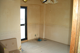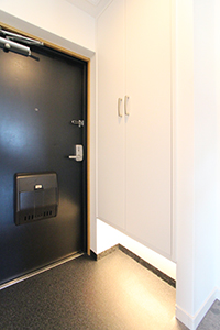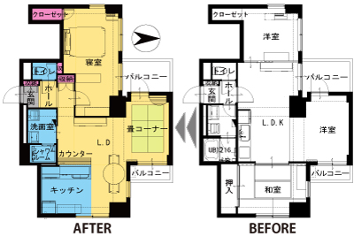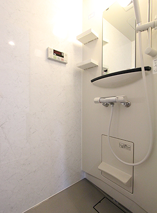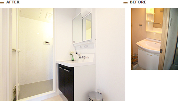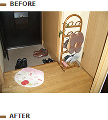 お風呂は、湯船につからないとのことでシャワールームをご提案し、洗面室・玄関を広くすることができました。デッドスペースとなっていた所は、寝室に取り込んでお手持ちの収納家具置き場にし、空間を有効活用しました。
