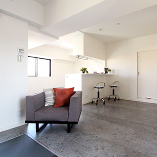 【LDK】床材はグレーの石目調フローリングにし、高級な印象に。