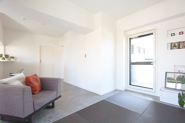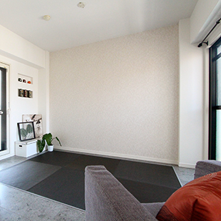 【畳コーナー】畳を敷いて寛げるスペースに。石目調フローリングの印象を壊してしまわないよう、ブラックの畳をご提案しました。お部屋全体の引き締め効果にも。