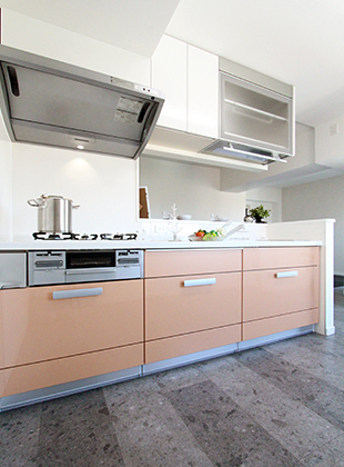 【キッチン】位置を変更して、T様お気に入りのオレンジ色の対面キッチンに。キッチンを窓の近くにしたことで、とても明るいキッチンになりました。