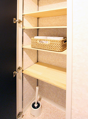 トイレットペーパーのストックや掃除道具の収納をつくりました。