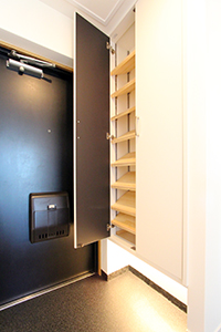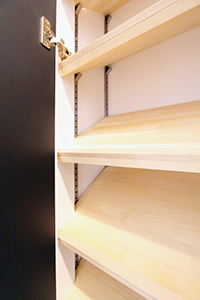 【玄関収納】棚板を斜めに取り付ける事で、空間を有効利用。可動棚なので、靴の高さに合わせて棚の高さを変更できます。