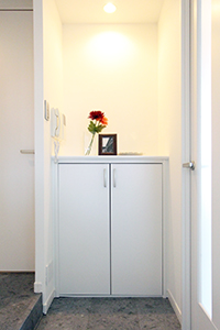 上部にはインターホンや電話を設置し、電話しながらメモをとる事もできます。また飾り棚や鍵置きスペースとしてもお使い頂ける、多機能スペースです。