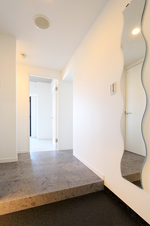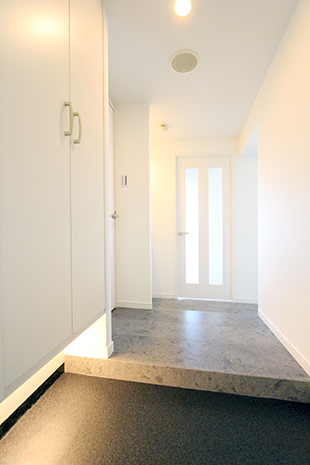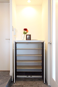 【玄関】玄関収納の下を浮かせて奥行き感を演出。実際よりも広く感じて頂けます。また間接照明を設けることで、圧迫感が軽減される効果も。