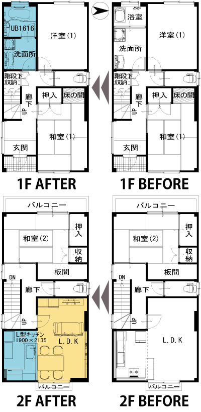 ■施工内容 /水廻りLIXIL3点セット/キッチン:リシェルL型1900×2135/UB:キレイユ1616サイズ/洗面化粧台:エルシィW750+キャビネット/床:防音フローリング、クッションフロア―/壁・天井:クロス/壁面収納、ニッチ造作/壁面収納:ダウンライト/給湯器:ノーリツ/天井塗装/