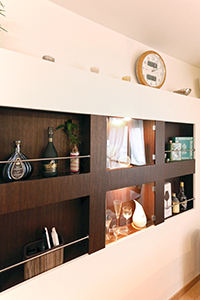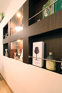 【壁面収納兼ディスプレイ】ご主人様が集めてこられたグラスや、ボトルのディスプレイをご提案。