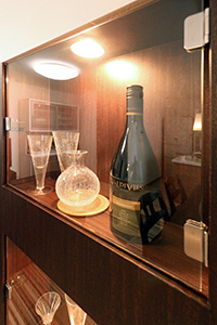 大切なグラスはガラス扉の中に収納できます。ダウンライトがお洒落な空間を演出。