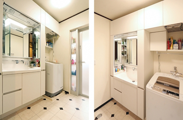 【洗面所】内装は白ですっきりとまとめ、清潔感を。機能性・収納量を充分に満足して頂けるようご提案しました。