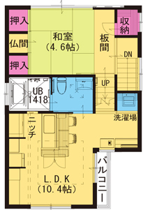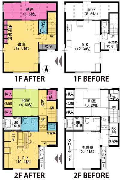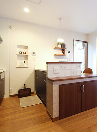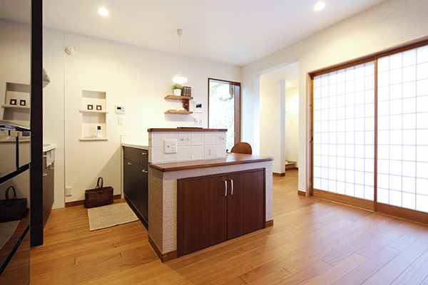 ■施工内容 /キッチン:LIXIL アミィⅡ型1500・900/トイレ:LIXIL [1F]アメージュZ、[2F]サティスGタイプ/洗面化粧台:LIXIL ミズリア/UB:既存/床:無垢フローリング、クッションフロア―(トイレ・洗面所)、一部既存/壁:クロス、珪藻土(LDK・書庫・2F階段)/収納、引出し付カウンター、ニッチ、棚造作/サッシ、畳新調/白蟻駆除工事/