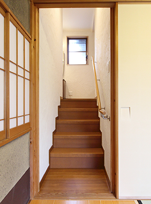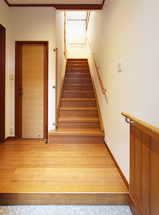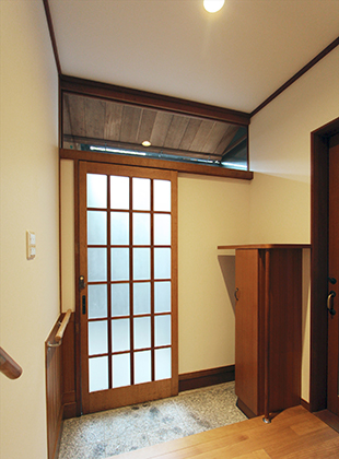 【玄関】京風のガラス戸から差し込むやさしい光を取り込みながら、ゆったりとした玄関のたたずまいの雰囲気を活かした空間に。和室へと続く階段は、お掃除のしやすさや手摺で安全性も配慮しました。