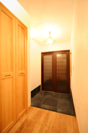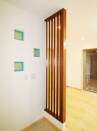 お子様がアレルギーということもあり、体にいい物を使用し、住みやすい家にしたいということで、天井・壁には調湿効果のあるしっくいを塗り、床には無垢のパイン材を使用しました。完成後に伺うとお子様が元気にLDKを走り回っていたのを見てこちらもうれしくなりました。玄関のスリット格子を既存利用するとおっしゃったのも、LDKの一番目に付くところに使用し思い出も残しました。より愛着のある家に出来たらと、しっくい塗る際にはお客様にも立ちあっていただき、実際に塗ったり、手形をつけたりしていただき、大変満足していただけとてもうれしかったです。