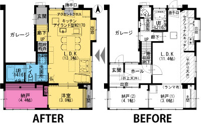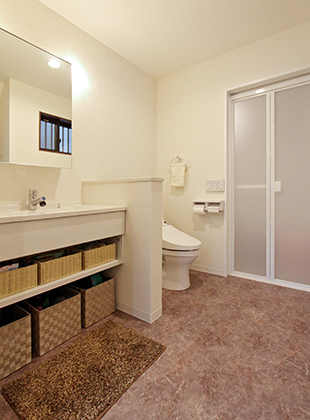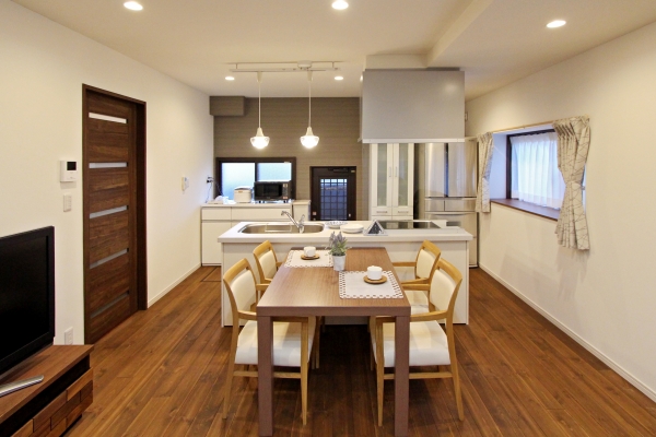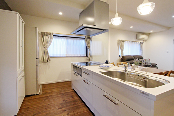 ■施工内容 /キッチン:LIXIL リシェルSi アイランド型W2710(IHコンロ)+カップボード/UB:TOTO リモデルバスルームWFシリーズ 1416サイズ/洗面化粧台:Panasonic シーラインW900/トイレ:TOTO HVシリーズ/床:無垢フローリング、クッションフロア(水廻り)、タイル(玄関)/壁・天井:クロス/収納、棚造作/玄関収納、インナーサッシ取付け/建具新調/サッシ新設/防蟻工事/