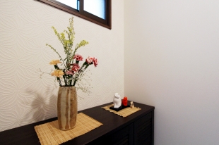 壁は洗面所と同じ花模様のクロスをコーディネートしました!(写真上)