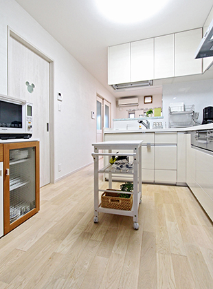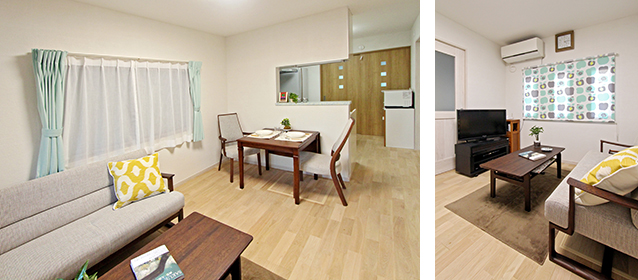 元々の壁を移動させてリビングを広げ、対面キッチンに。キッチンからリビングが見渡せ、会話が弾むLDKをご提案。また、ロールスクリーンは窓ごとではなく1枚ものを取り付けることでタペストリーのようにお部屋の表情が変わります。(写真右)