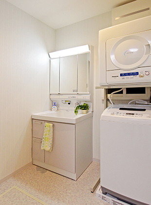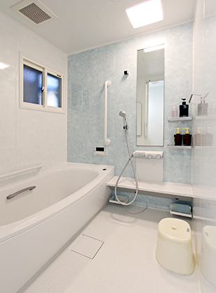また「せっかくのリフォームなのでちょっぴりお洒落にしたいけれどどんな風にしたらいいか分からない」とご相談を頂きましたので、奥様が気に入られた浴室壁の水色をベースとして、洗面所の床・壁、LDKのアクセントとしてご提案したタイルやロールスクリーンを同色系にして、統一感があるコーディネートをさせて頂きました!