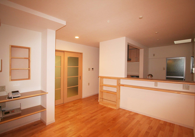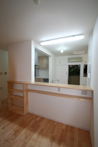 リビングとDKを程よく仕切る引き戸を全開にすれば、広々リビングに。無垢材を採用したので、冬はあたたかく、夏は爽やかに過ごしていただけます。奥様の家事のしやすさを追及し、対面キッチンの内にはパントリーや家事デスクを設けました。また、もともとあったガラス瓦をトップライトとして利用したので明るいキッチンとなりました。