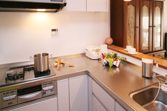 ご夫婦の仲がとてもよく、素敵なご夫婦でした。とても長年連れ添った、という感じではなく新婚さんみたいでした。 広いはずの空間が有効的につかえていないのではということで、LDKを広く明るくしました。お手持ちの収納棚もありましたが、もっと使い勝手がよくなるようにキッチンの奥に収納を造作。レンジも置けるように間には空間を作り、下はゴミ箱が置けるスペースも作って、オープンキッチンにありがちな”散らかった”感じが出ないようにしました。
